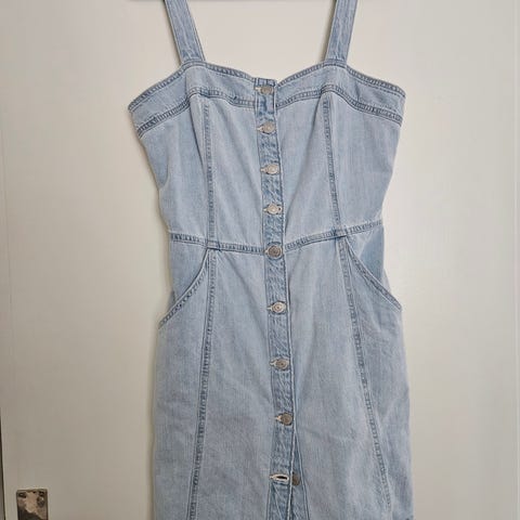 Part Two Hverdagskjole i blå denim, størrelse 44 for damer. Kjolen har brede skulderstropper og knappelukking foran. Den er laget av denimstoff og har elastisk ryggparti for bedre passform.