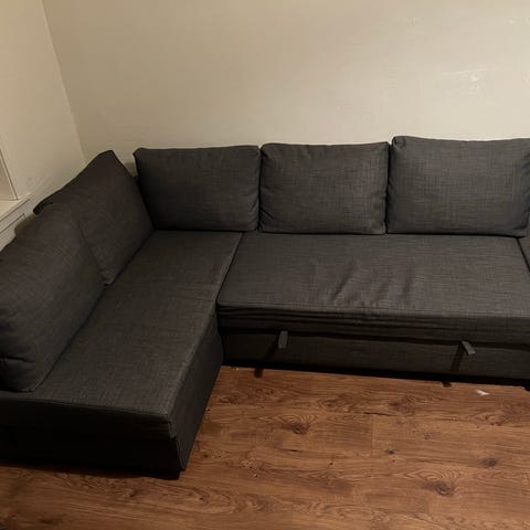 Den nydelige sovesofaen ønskes solgt pga. at den blir veldig lite brukt. Det er grått stoff. Den er kjøpt hos enten A-Møbler eller fagmøbler, for ca. 6 år tilbake. Har bare blitt liggende i det ekstra rommet vi har. Ingen flekker eller skader, har jeg lagt merke til. Den er hel og pen. Mulig å oppbevare ting under sjeselongen. Har ikke kvittering siden jeg ikke finner den. Prøvde å finne den samme på nettsiden, men tror ikke den finnes lenger.