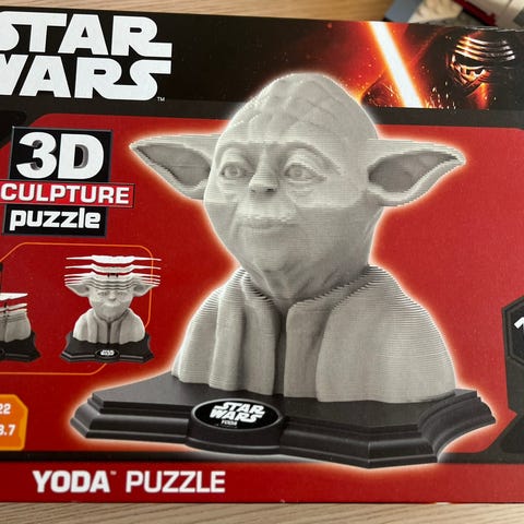 Inneholder 4 puslespill i forskjellige størrelser med karakterene: Yoda, R2D2, C3PO og Anakin Skywalker (Darth Vader).