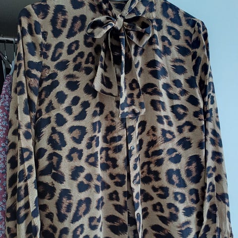 Mønstret bluse i fargene offwhite/kaki, i nydelig kvalitet i 70% bomull og 30 % silke, langt skjerf i samme stoff og print følger med. Str XL, litt liten på størrelsen. Brukt en gang og fremstår som pen. Selges samlet.