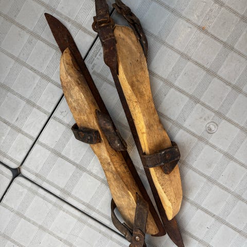 Disse skøytene er laget av støpt stål og har lærstropper for å feste dem til skoene.
