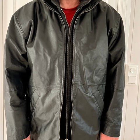 En sort dress skinnjakke i kalveskinn. Den er kjøpt på Side Leather i Tyrkia på slutten av 90-tallet. God kvalitet på skinnet.