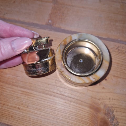 Vakkert lite håndlaget marmorskrin med lokk med innlagte halvedelstener. Laget i India. Størrelse 5,5x4,5x3 cm. Et ørlite skår på kanten, se siste bildet. Kan sendes med PostNord for kr 69,-.