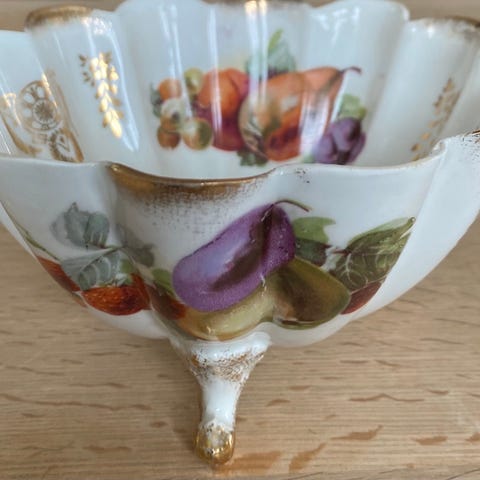 Skål med rosemotiv og gullkant. Merket Lotus Collection under. Den er i god stand. Høyde: 5 cm. Diameter: 15 cm.