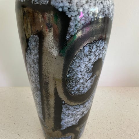Keramisk krukke, sannsynligvis raku-brent. Omlag 40 år gammel. Omtrent 20 cm høy og 22 cm i diameter.