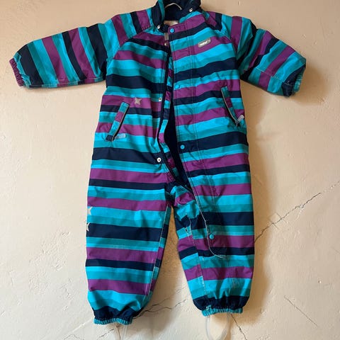 Reima barnedress i størrelse 98 for jente. Dressen er rød med mønster og har svarte forsterkninger på bena. Den har glidelås foran og er laget for å gi god beskyttelse mot vær og vind. Passer for utendørs bruk for barn i denne størrelsen. Noen hull og rifter er reparert (sydd), men mye god bruk igjen.
