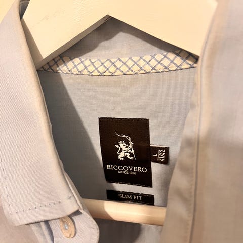 Moods of Norway skjorte i størrelse M. Skjorten er blå med hvite mansjetter og krage. Den har knappelukking foran og en liten logo på brystlommen. Materialet er ikke spesifisert, men skjorten har et rutemønster og kontrasterende detaljer i hvitt.