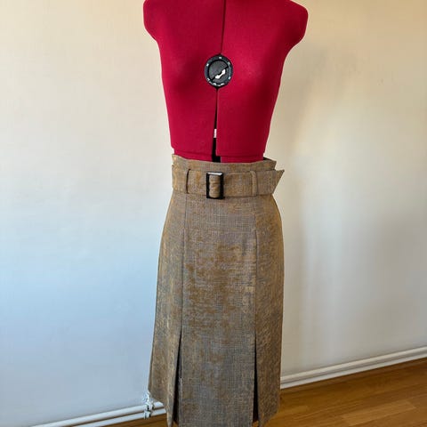 Beige langt skjørt for dame i størrelse XS. Skjørtet har høyt liv med beltehemper og lukkes med knapp og skjult knappestolpe foran. Det har rette linjer og ankellang lengde. Passer til hverdagsbruk eller mer formelle anledninger avhengig av styling.