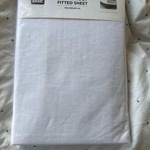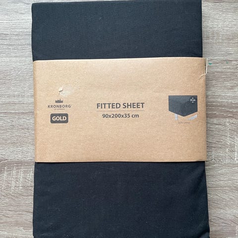 Jersey laken kjøpt på Jysk. Merke Kronborg Plus. Mørk grå farge. 60% bomull og 40% polyester. L 200 cm, H 40 cm B 90 cm