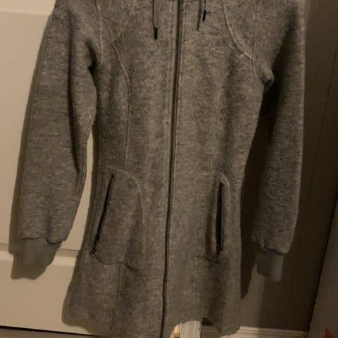 Selger denne nydelige vinrøde kåpa fra Bergans. Modellen heter Oslo Wool og er i størrelse S, men oppleves mer som en størrelse M.