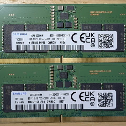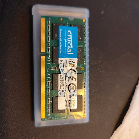 Crucial RAM 16GB (2*8GB)DDR5 SODIMM-moduler designet for bruk i bærbare datamaskiner og små formfaktor-PCer. Moduler med høy ytelse og lavt strømforbruk, kompatible med systemer som støtter DDR5-minne. Selger RAM fra 2 år gammel lite brukt laptop som aldri har vært overklokket grunnet oppgradering til 32GB.