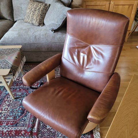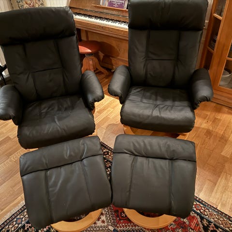 2stk lenestoler i mykt sort skinn og hvitoljet eik dansk design og kjøpt i Danmark selges 3000kr. per stol. 1stk fotskammel i samme serien selges for 1000kr eller bud. Jeg kan ikke sende de, men kan møtes for levering mellom Skien og Tønsberg et sted.