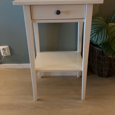 Hemnes nattbord fra IKEA, med skuff og hylle. Hvit.