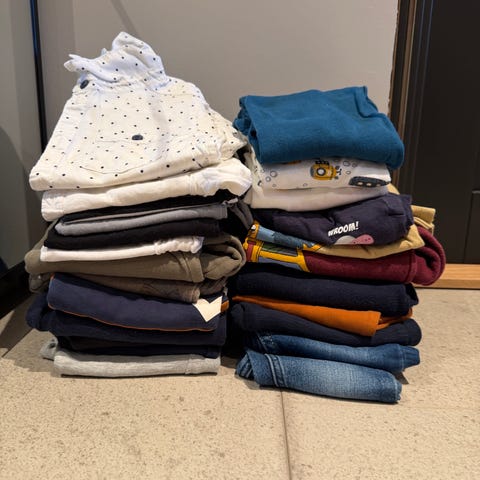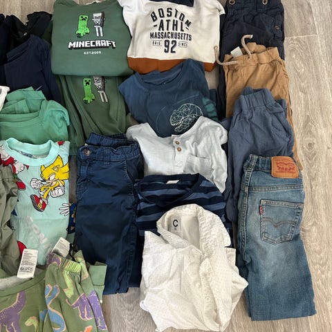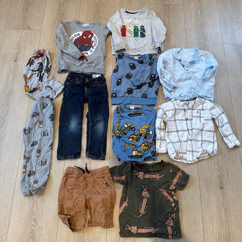 Barneklær pakke bestående av flere plagg i størrelse 92 for gutt. Inkluderer ulike typer klær som gensere, skjorter, bukser og hettejakke i flerfarget design. Materialene varierer og klærne er egnet for barn i denne aldersgruppen.