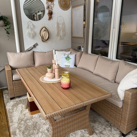 Hjørnesofa med bord selges. Den har røket i rottingen på ett sted i ryggen og ett lite rift i en pute (se bilder). Flott gruppe som holder ett par somre til:)