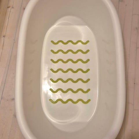 Ekstra stor badebalje med stativ. Det er svært solid og stabilt. Godt med kurver for oppbevaring av diverse på badebaljen. Kan brukes til to barn samtidig. Nypris var 1700, selges for 500.