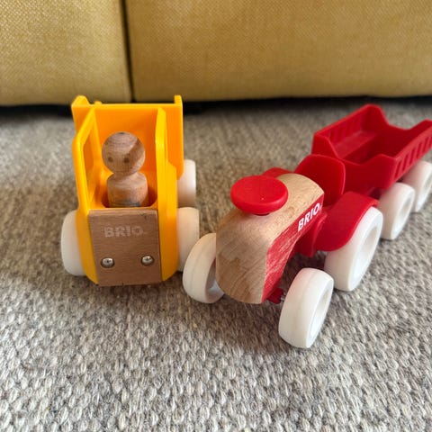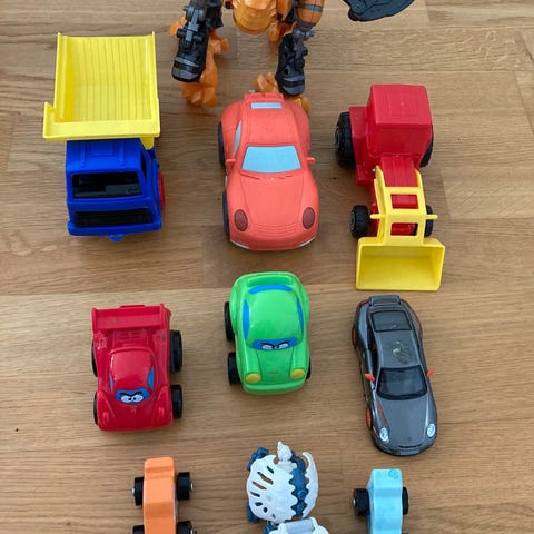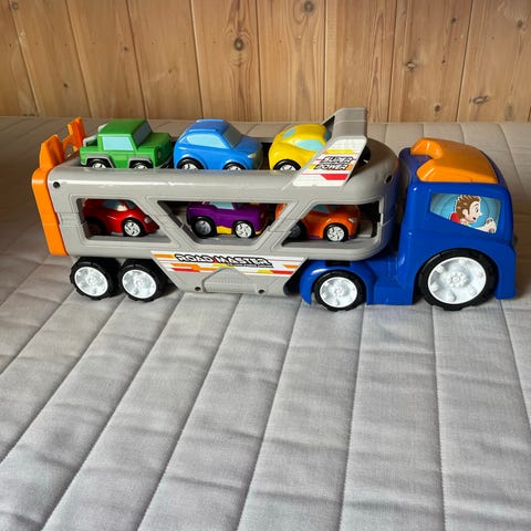 BRIO lekesett bestående av en lastebil med tilhørende små biler i ulike farger og former. Laget av plast, egnet for barn. Settet inkluderer en lastebil med plass til flere små biler, som kan plasseres og tas ut. Passer for barn som liker billek og rollelek. Noen hjul er litt stive