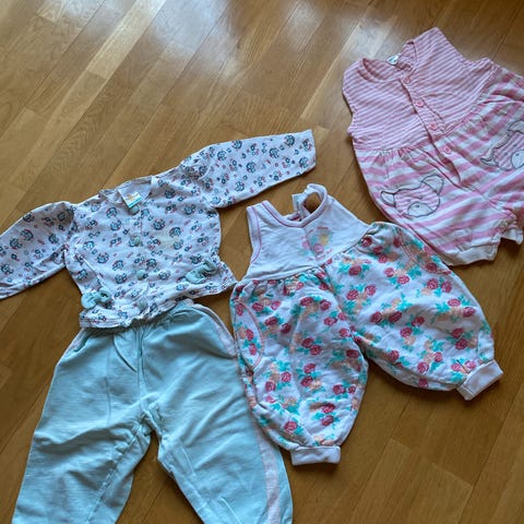 Eldre barnetøy fra 80-tallet rundt str 68/74/80, brukt som dukketøy etter blitt brukt som babytøy.