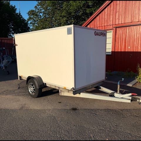 Gaupen Lukket Tilhenger med hvit farge og 1-akslet chassis. Tilhengeren har lukket lasteområde med dobbel bakdør og låsemekanismer. Egnet for transport av varer som krever beskyttelse mot vær og vind.