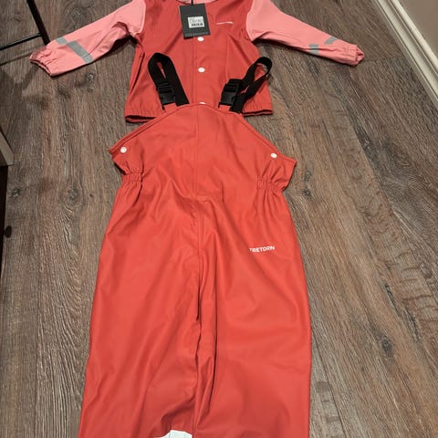 Tretorn regntøy sett for barn, størrelse 86, designet for jenter. Settet består av jakke og bukse i rosa farge. Jakken har hette og knapper, mens buksene har justerbare seler. Materialet er vanntett og egnet for utendørs bruk i vått vær.