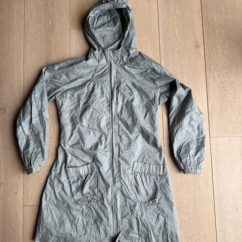 Pen og praktisk regnjakke fra Anne Miller, fôret, lang og litt innsvinget modell. Str 36 (romslig). Glidelåslukking, store skrålommer med glidelås, innerlomme med glidelås. Nydelig brun-beige farge med små hvite prikker. Fremstår som ny.