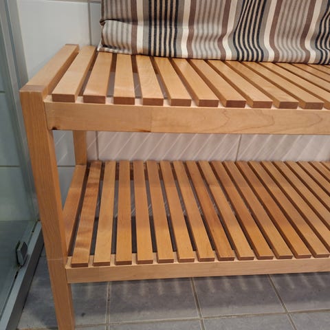 Plass til godt med ved. Ubehandlet, har hatt fet grønnsåpe på. Meget stabilt og solid. Våtromsplate i bunn. Kan evt males, El forgylles😀mål ca 36 dyp, 106 bred, 107 høy.