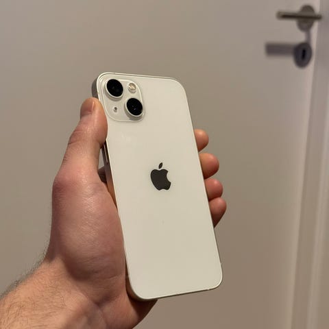 Apple iPhone 13 128 GB i mobiltelefon i fargen Starlight. Enheten har 5G-støtte og leveres med original emballasje. Telefonen har et dobbelt kamerasystem på baksiden og en skjerm med notch på forsiden.