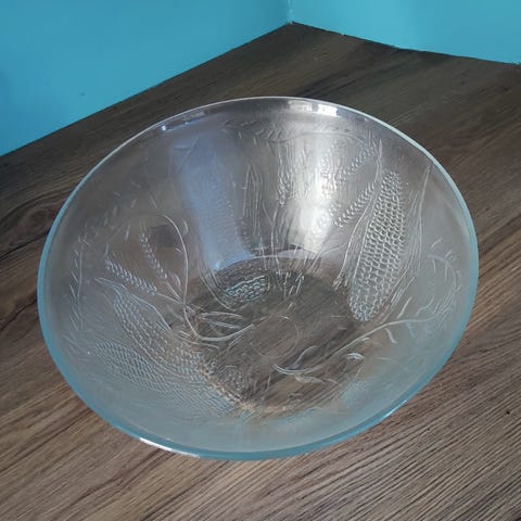Stor glassskål/bolle i gjennomsiktig glass.. Nydelig mønster i bollen men vanskelig å få gode bilder.