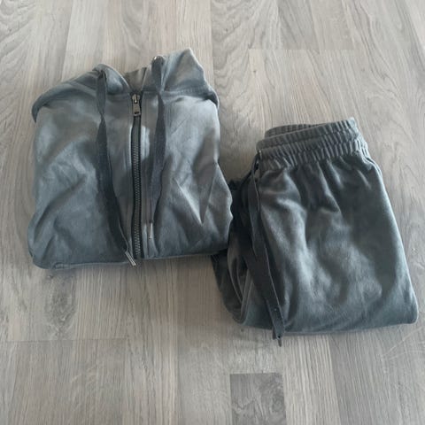 Hettejakke og joggebukse med rette ben. Siste bildet viser ikke riktig farge. Den er svart og i merket Oxford street. Nesten ikke brukt.