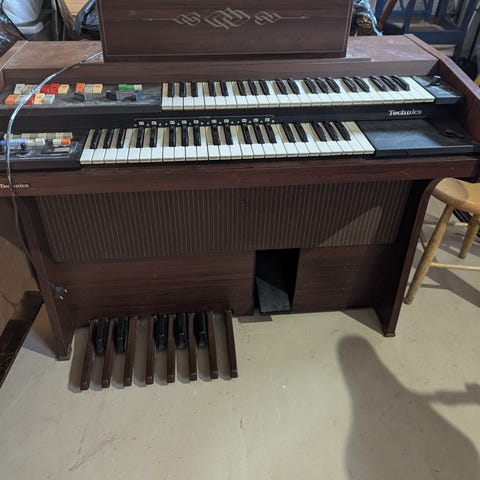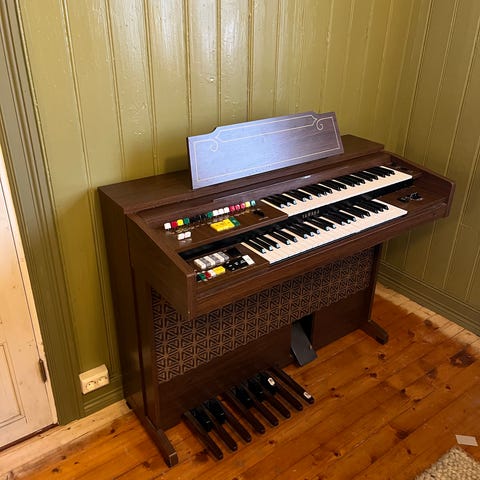 Vintage elektronisk orgel med et tre oktavers tastatur, flere kontrollknapper for lydjustering, og pedalbrett.
