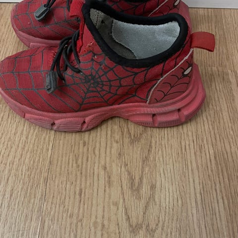 Spiderman barne sneakers i størrelse 25, designet for unisex bruk. Skoene har en svart og rød fargekombinasjon med Spiderman-tema. Materialet er egnet for barn, og skoene har lisser for justering.
