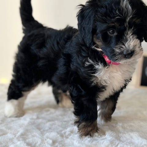 Både Bonnie og faren er en multigenerasjons mini goldendoodle. De er genetisk testet for 270 sykdommer via Embark dog DNA. Blant annet er de testet for degenerativ myelopati, NEwS-mutasjon, prcd-PRA-mutasjon og vWD1 (von Willebrands sykdom). Farge – tuxedo. Opprinnelse – USA. Alle tester blant annet RG hofte var utmerket.
