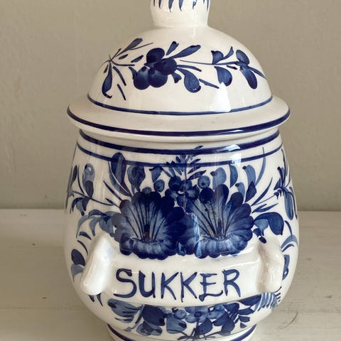 Blå blomster, og tekst på krukkene. Oregano, paprika. Kardemomme, aromakrydder og kanel. Høyde 9 cm med lokk. Diameter 7 cm. I flott stand. Pris 100,- pr stk evt 450,- for alle.