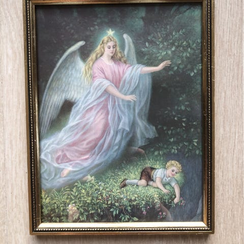 Fint gammelt trykk av en skytsengel og en liten pike. Original gammel ramme med litt bruksmerker, en svak vannskjold øverst til høyre. Ny papp og tape på baksiden. Bildet inkl. rammen måler 19 x 25 cm.