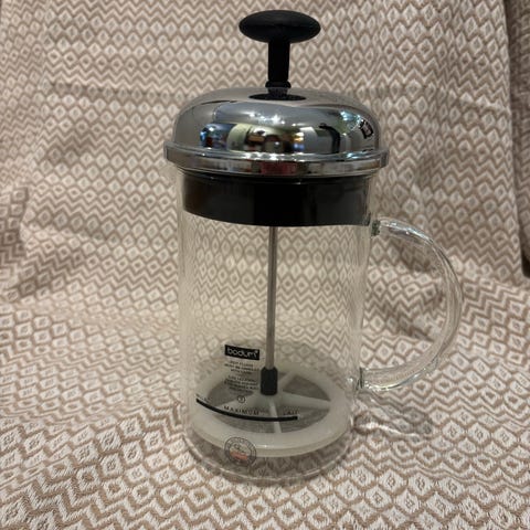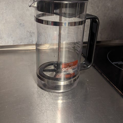French Press kaffebrygger med glasskanne og metallramme. Kapasitet på 1 liter, egnet for brygging av kaffe. Utstyrt med håndtak i plast for enkel håndtering.
