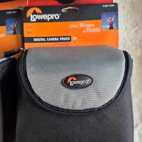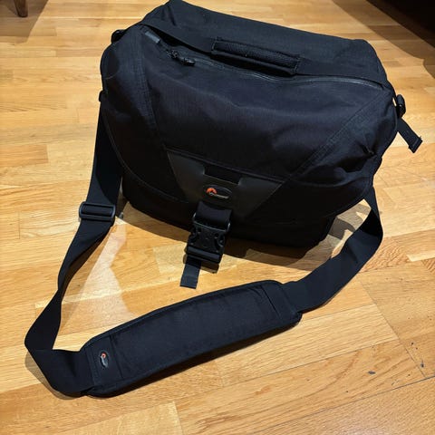 Selger meget god fotobag med mange lommer og fleksibel innredning. Lukkespennen har en brukket "tann" (se bilde) men lukker og holder godt igjen. Ikke kritisk da lokket lukkes med glidelås, så i værste fall er det "plappen" som åpnes (se bilde). Selger defror meget billig. kr. 200,-
