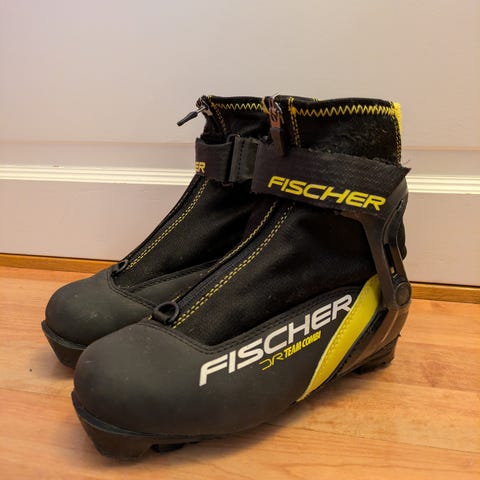 Fischer JR Combi langrennssko for barn i svart og gul farge. Skoene har borrelås og glidelås for lukking, samt en slitesterk såle egnet for kombinasjonsbindinger. Materialet er tilpasset for å gi støtte og beskyttelse ved langrenn.