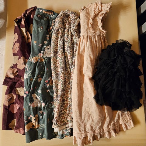 Den hvite/svarte kjolen er størrelse 4-6 år, men er mye mindre enn kjolene i den størrelsen. Derfor vil eg si at den er størrelse 3-4 år. Kjolene er fra H&M, Cubus og Name it
