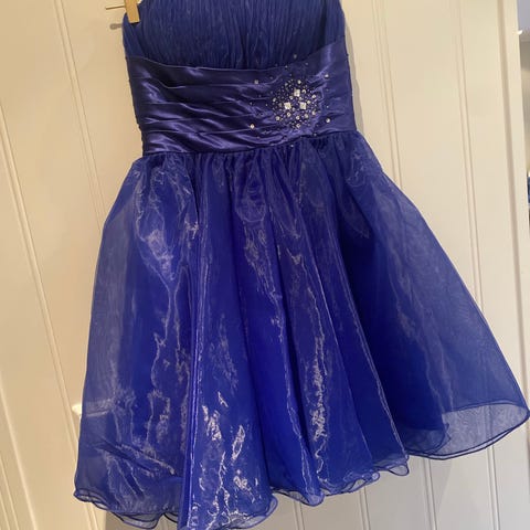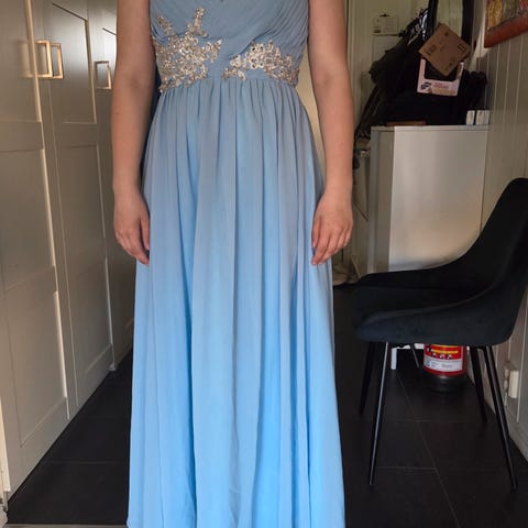 Ballkjole fra Grace Karin. Str M (liten i størrelsen). Stroppe knyting bak på ryggen. Blanke skulder stropper følger med kjolen. Påsydd fester for skulder stropper. Lengde fra underarm og ned er 67 cm. Personen på bildet er 167 cm høy. Pent brukt. Selges for kr 150,-