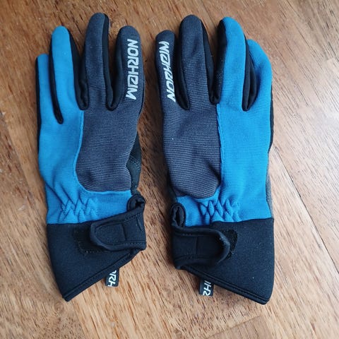 Norheim skihansker designet for vinterbruk, langrenn, med vannavstøtende materiale. Hanskene har blå og rød fargekombinasjon, med justerbare stropper. Pent brukt, ikke synlig slitt.