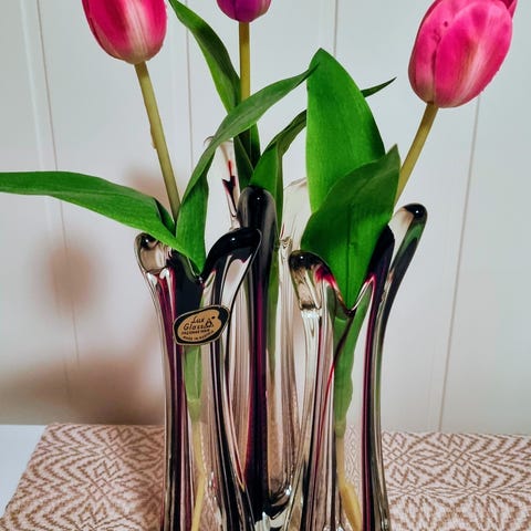 En vakker potpurri-krukke fra Randsfjord Glassverk selges for 300 kroner. Krukken er hel og pen. Ingen skader, har kun stått til pynt.