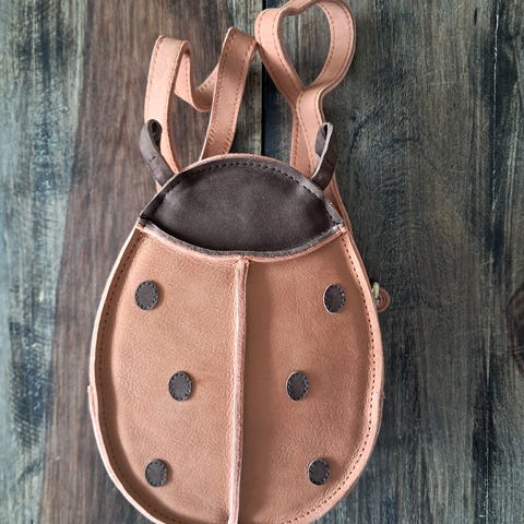 Nydelig bamsesekk og babytøfler fra Donsje Amsterdam. Sekk i ekte skinn.