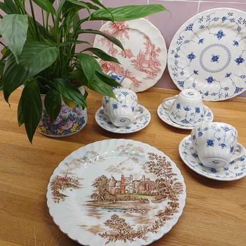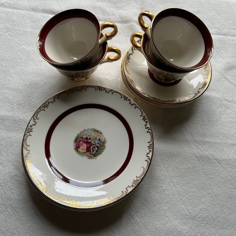 Fløtemugge og sukker kopp. 6stk. mokka kopper,2stk.fat Stavanger Flint,6stk.fat Egersund Flint, 8stk. skåler Stavanger Flint. 2stk. kakefat Stavanger Flint. Selges samlet.
