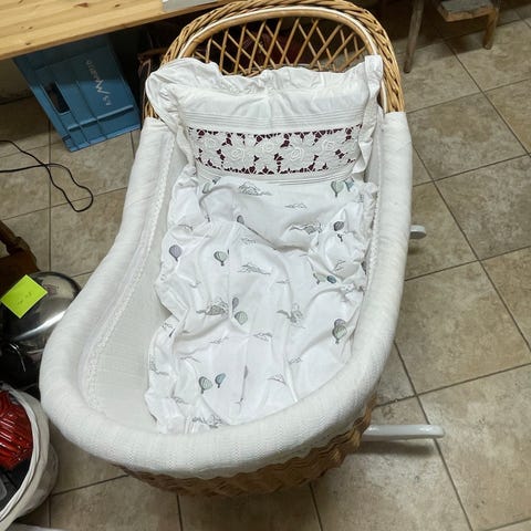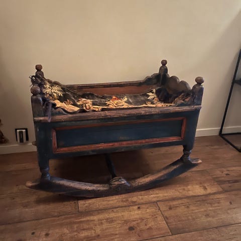 Antikk tre vugge L82 * H70 *B72. Laget av naturlig treverk med spiler på sidene og utskårne detaljer. Passer til bruk som barneseng eller dekorativ møbel.