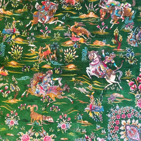 Teppet har høy knutetetthet og silke av ypperste kvalitet, noe som gir den karakteristiske “to-tone”-glansen man ser når man beveger seg rundt teppet.