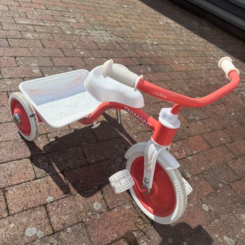 Godt brukt 3 hjuls sykkel med styrestang, sele og oppbevaringsboks. Styrestang er litt redusert i sving men fungerer.