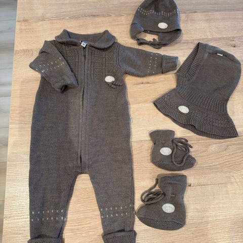 Grå, tykk lillelam ulldress selges med votter og sokker. Dressen har et hull bak på skulderen som vi har stoppet, ellers hel og fin.