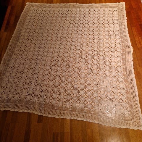 Ny heklet duk i hvitt bomullsgarn.