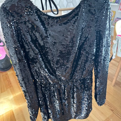 NA-KD festkjole i svart farge, størrelse 38 for kvinner. Kjolen har lange ermer og en firkantet halsutringning. Materialet har en glatt og blank finish. Passer til formelle anledninger.