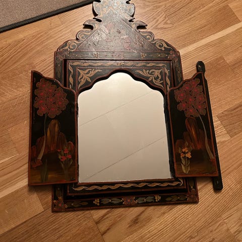 Speil fra Perfekt Home som en kan klappe sammen om en ikke vil ha oppe speilet. Str: 53,5 cm. i bredden og 58,5 cm. i lengden. Den veier 5,5 kg.